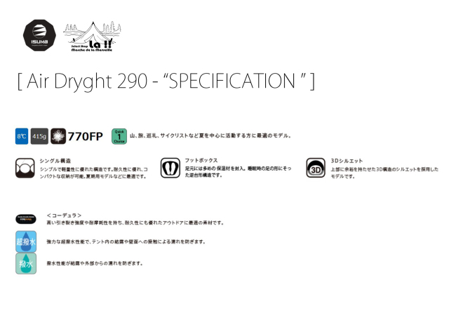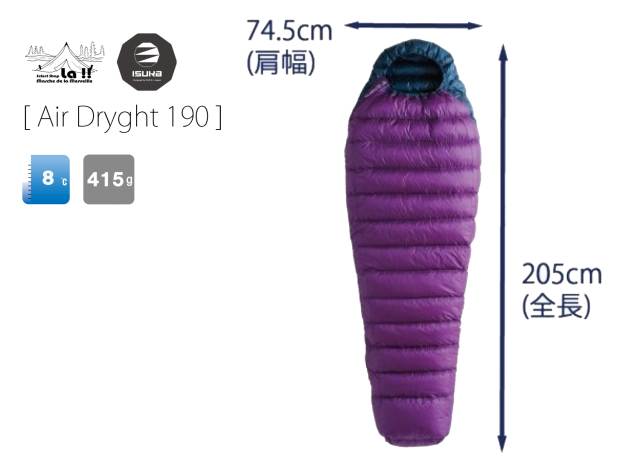 ナノ撥水加工の高品質なドライダウン190gを使用した、夏の中級山岳でのテント泊や、避難小屋での宿泊に最適のモデルです。