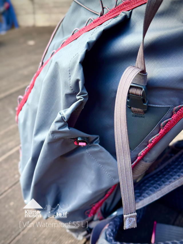 ロールトップ型の開口部を採用し、バンジーコードやトグルループでトレッキングポールやハイドレーションシステムを取り付けることができます。