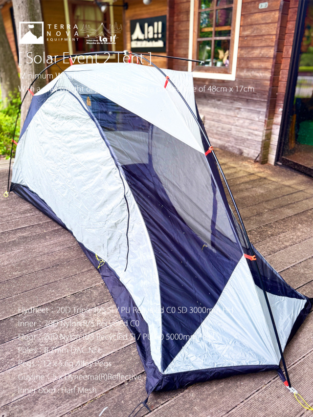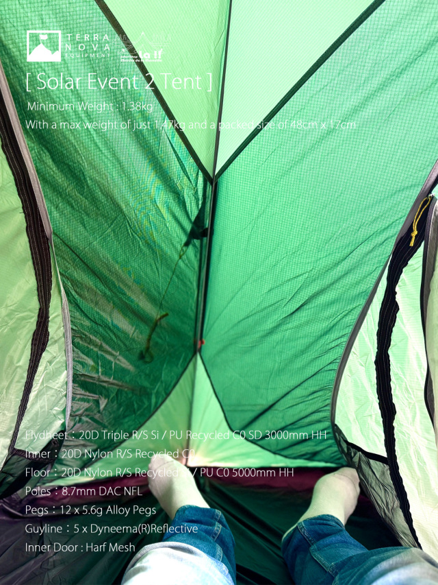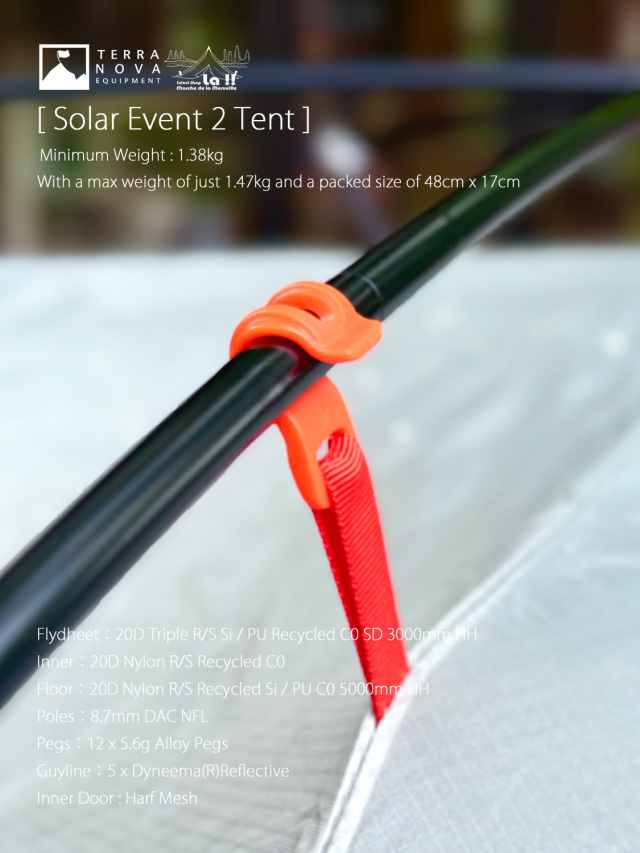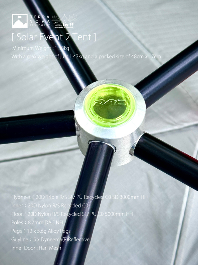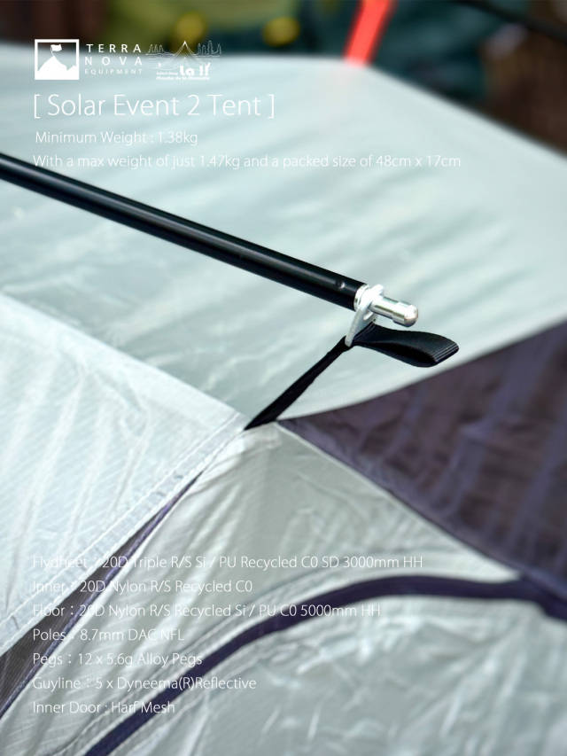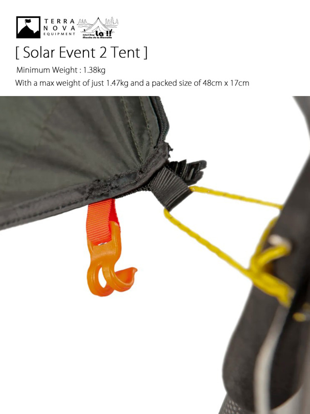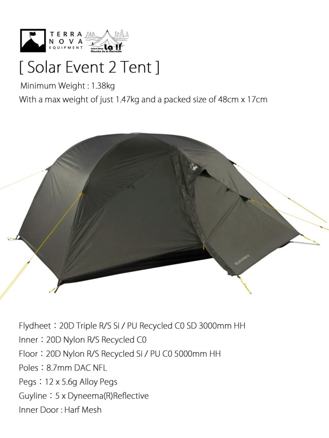 Terra Nova社の新しい素材、設計を採用した Solar Event 2は、軽量でありながら広々としたシェルターを持ち、耐風、耐雨、強度までを持ち合わせたパフォーマンスに優れたテントです。