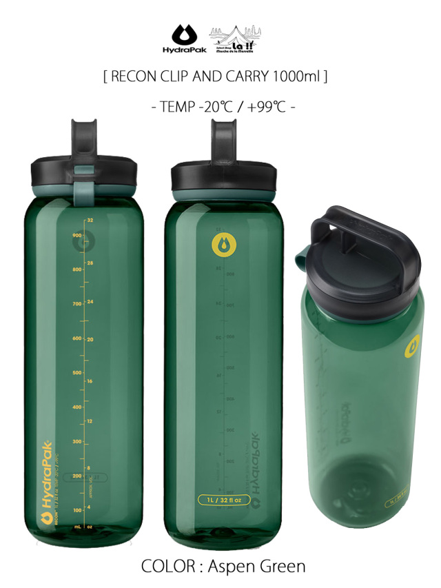 リーコン・クリップ&キャリーは、軽量で頑丈、耐熱温度:-20℃ 〜+99℃ というハイスペックなリサイクル・トライタンを使用したボトルの1000mlサイズです。