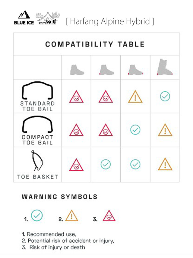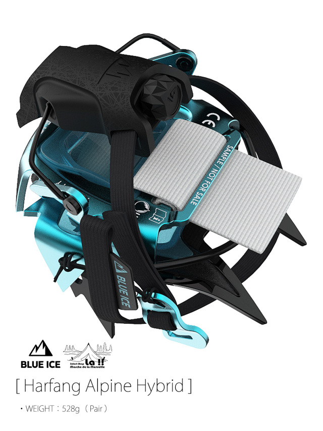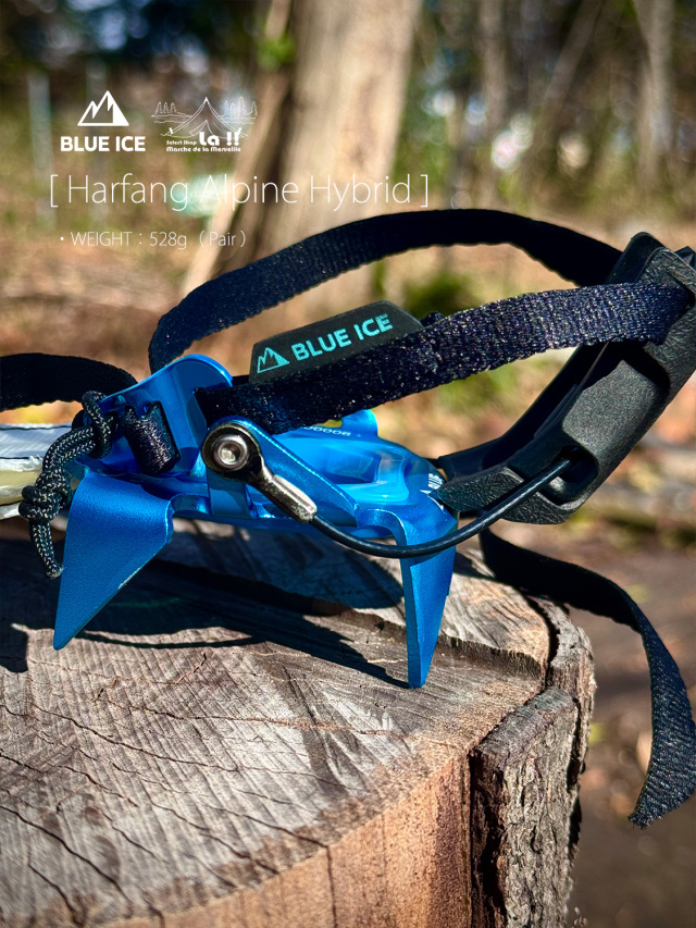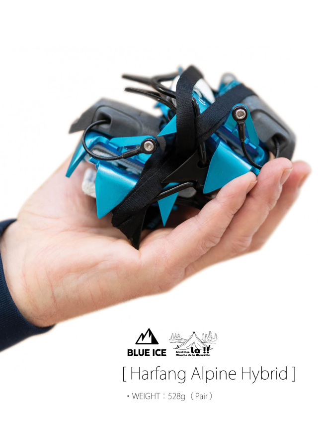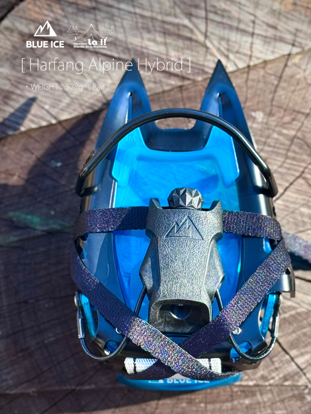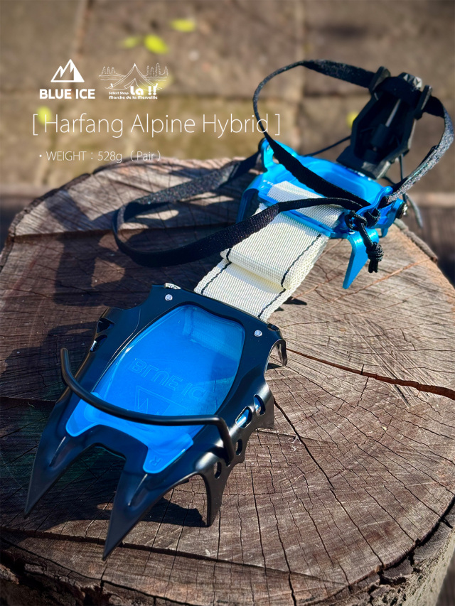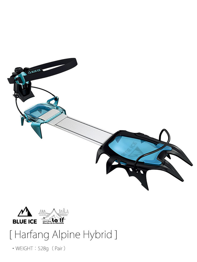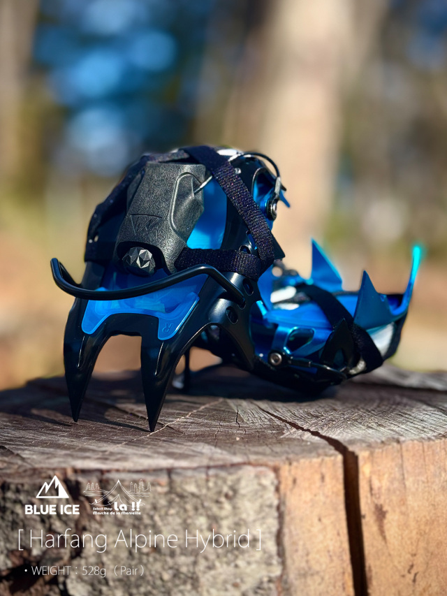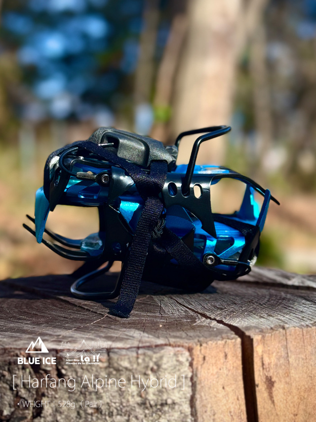 Harfang Alpine Hybridは、クロームモリブテン製のフロントと、アルミニウム製のリアを組み合わせたハイブリッドバージョンの登山用12本爪クランポン(アイゼン)です。