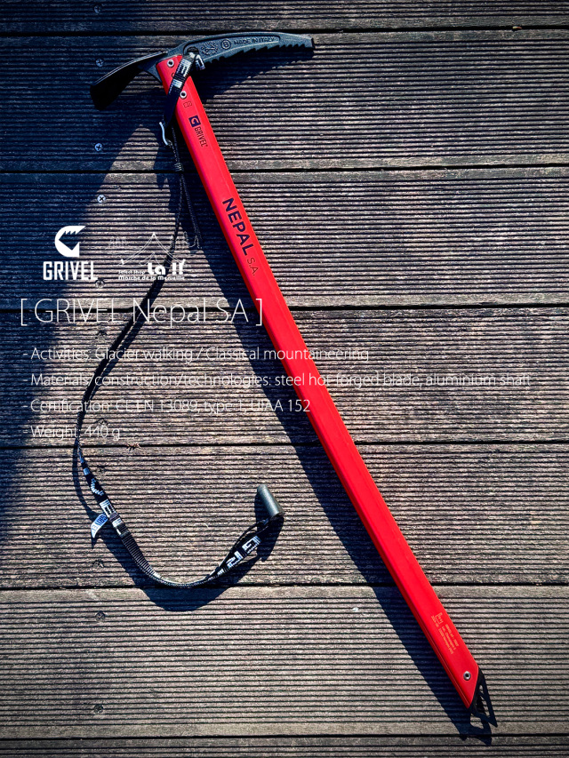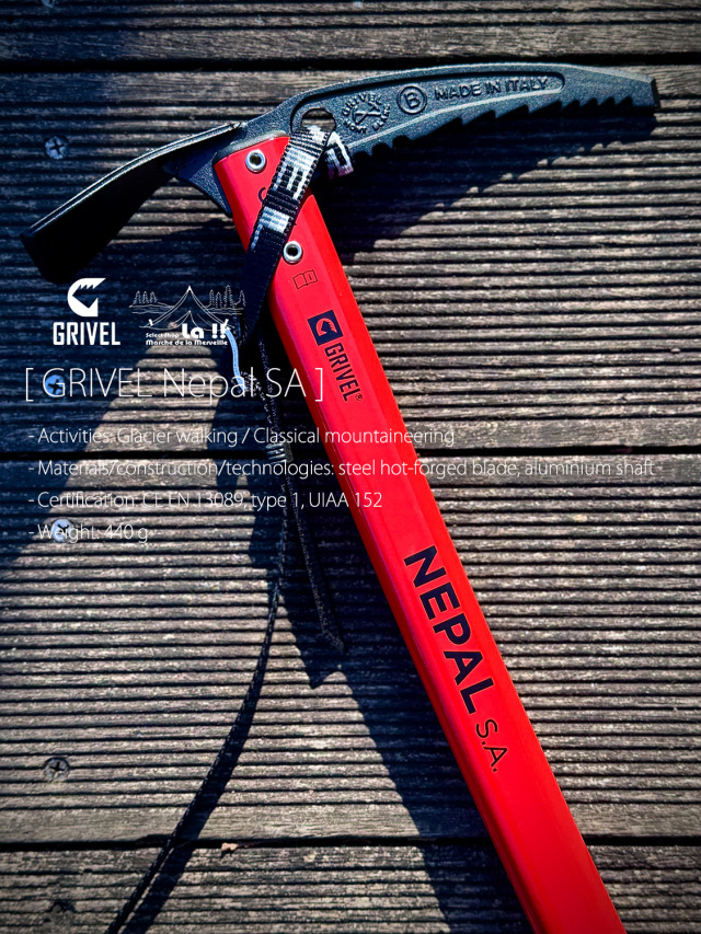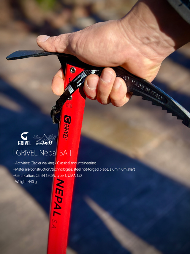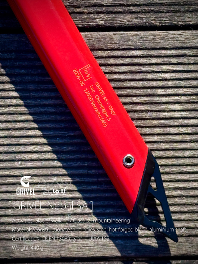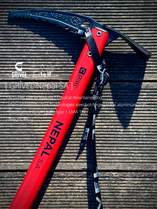 一般的な雪山登山、氷河歩行用に設計されたネパールSAは、ヘッドに軽さと剛性に優れた熱間鍛造ニッケルクロムモリブデン鋼のグリベルスチールを使用し、アクシデント発生時には滑落停止動作を取りやすい弛やかなSA カーブのアルミ製シャフトを持つピッケル。